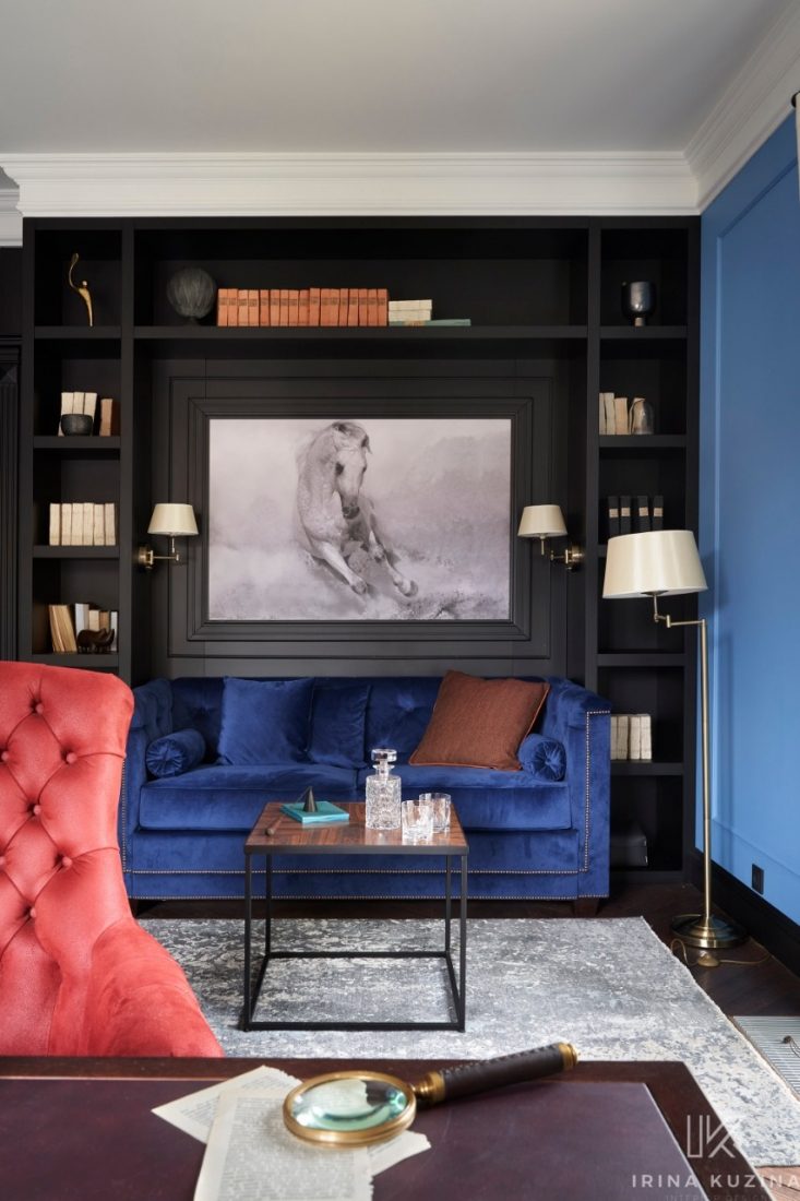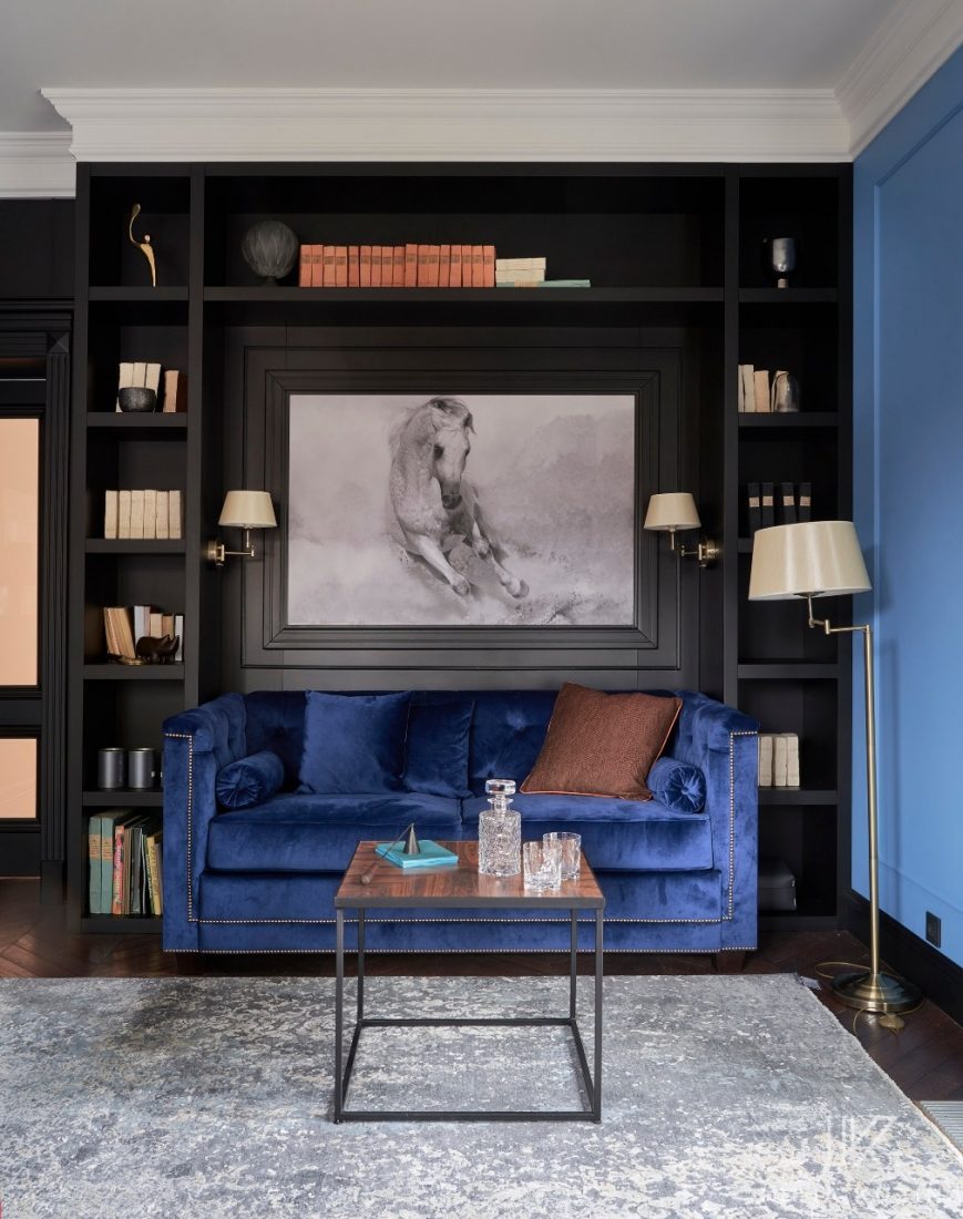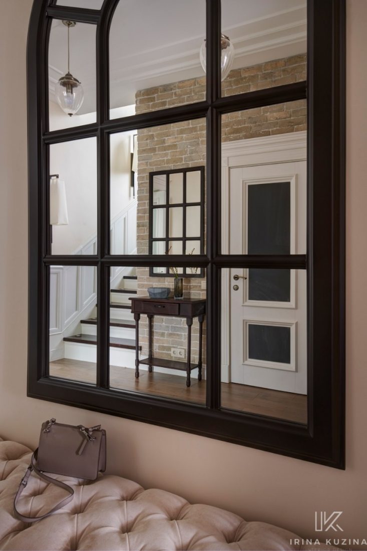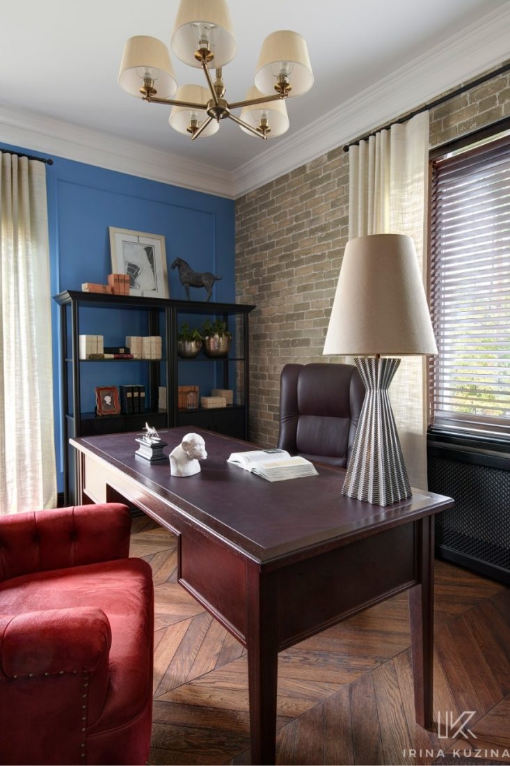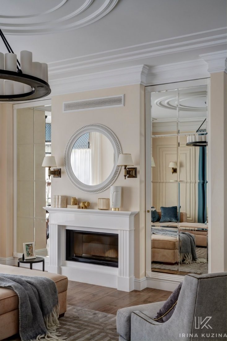 Если говорить об интерьере, то из интересных моментов хочется отметить камин. По проекту дома дымоход располагается в углу. Мы же его разместили по центру стены и обыграли трубу таким образом, что она находится под углом за шкафами, которые располагаются теперь слева и справа от камина.