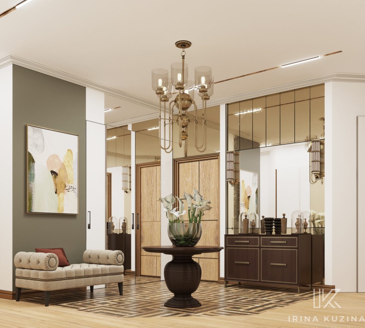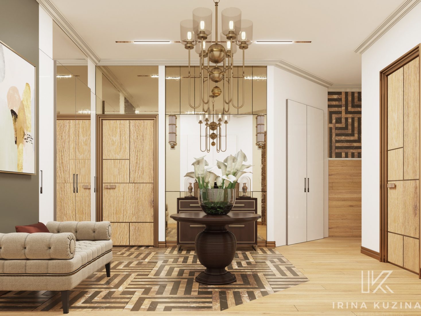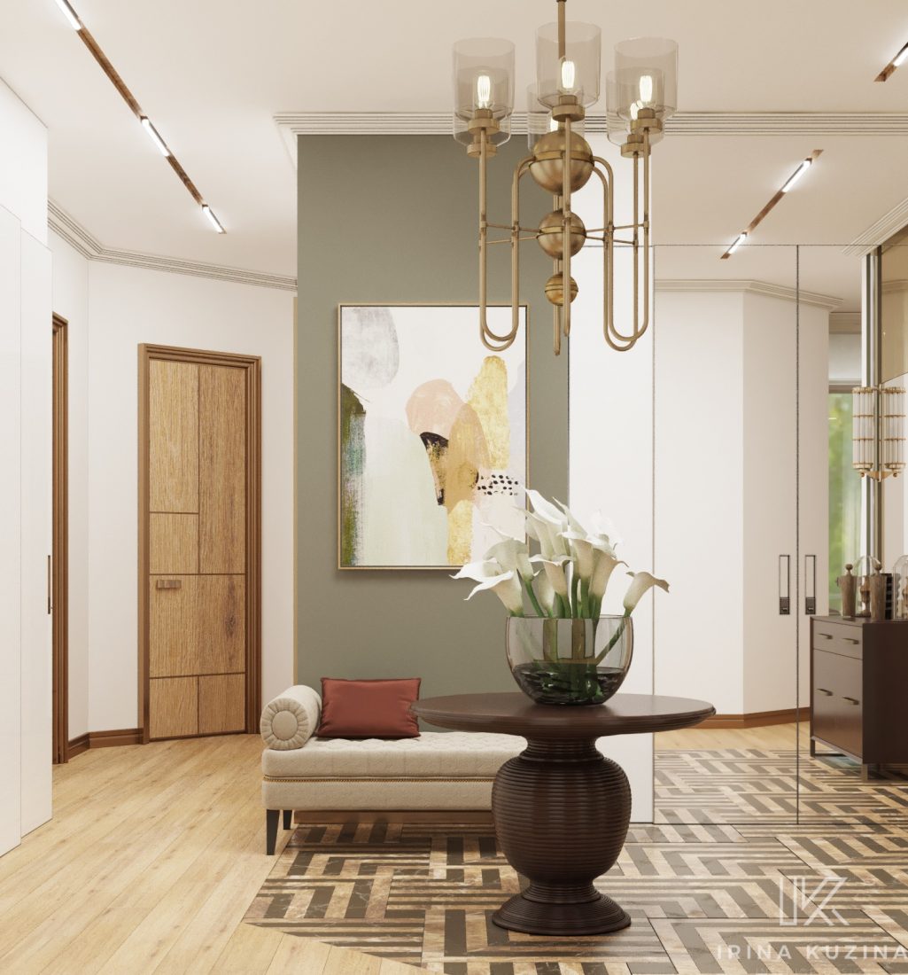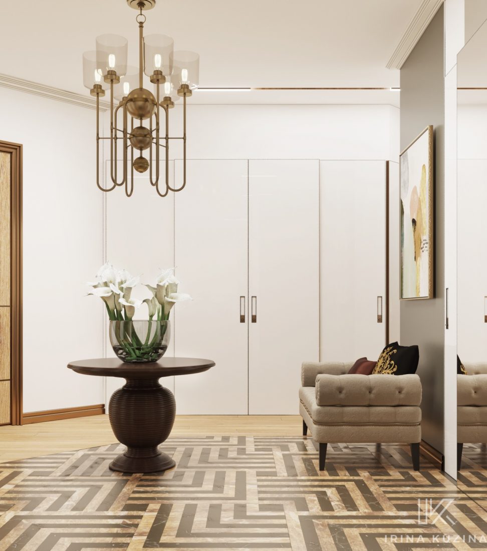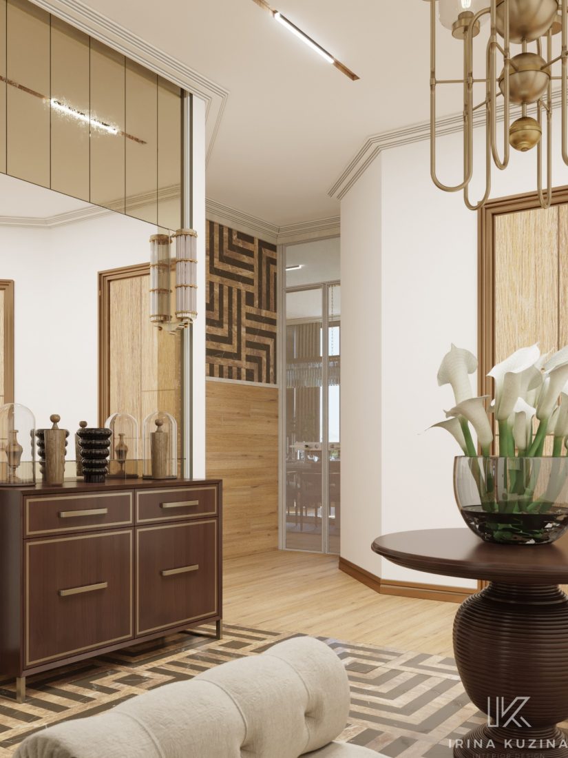 Большой и красивый холл – лицо квартиры, при входе в который сразу понятен тонкий вкус хозяйки. Оригинальное сочетание керамогранита и инженерной доски под ногами задает интересный ритм, который продлевается в общую зону. Также в центре холла консоль и место, где будут стоять живые цветы.