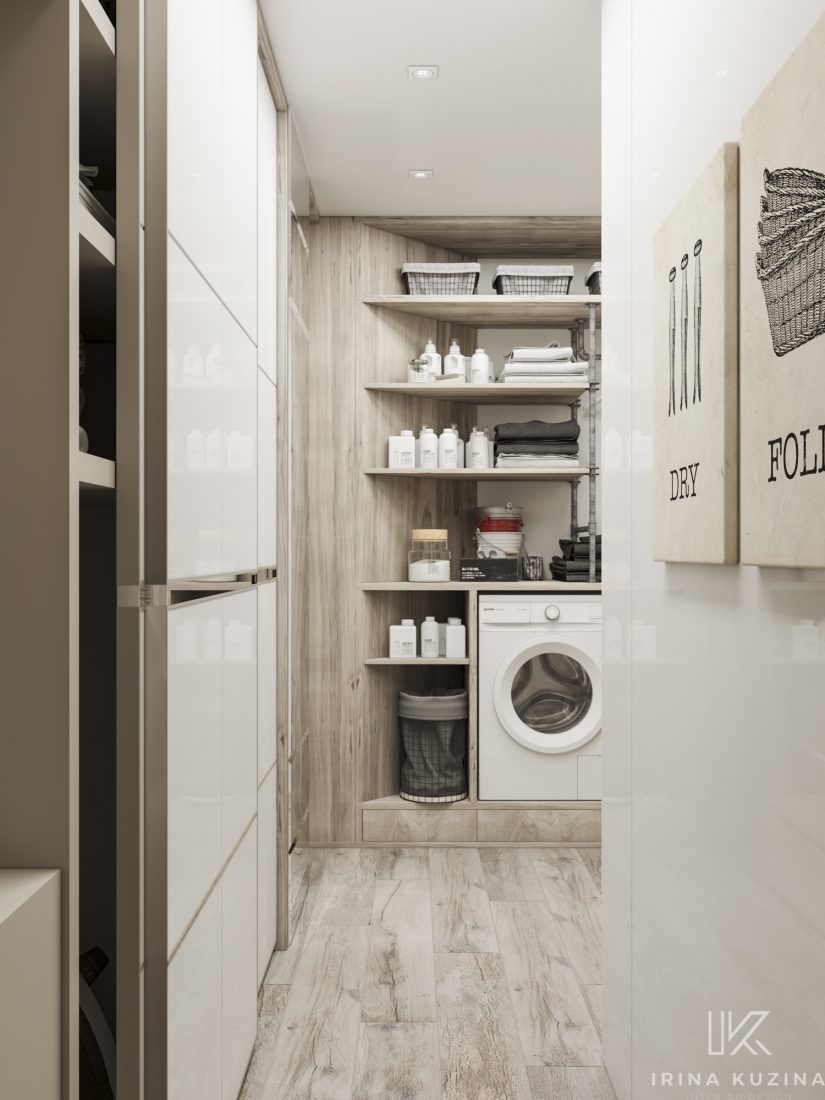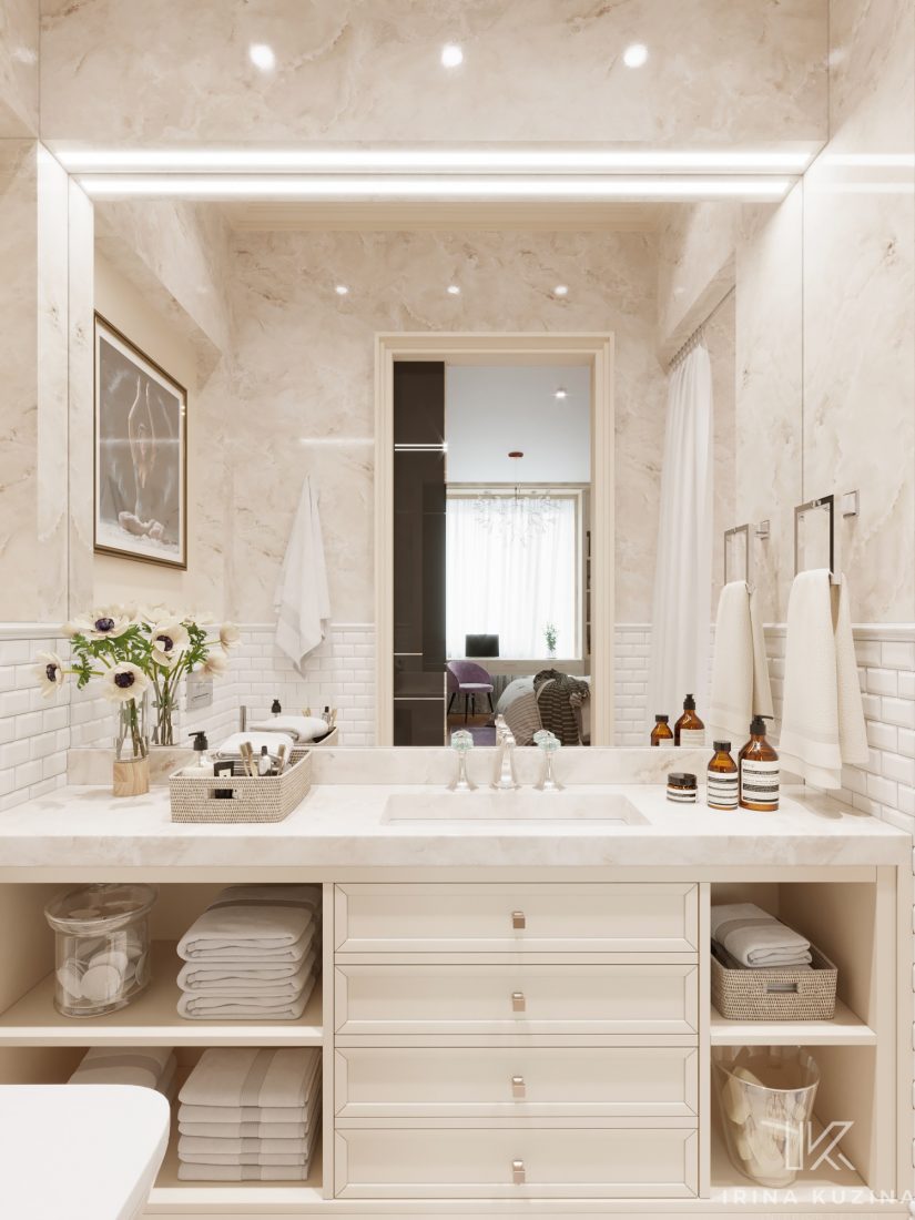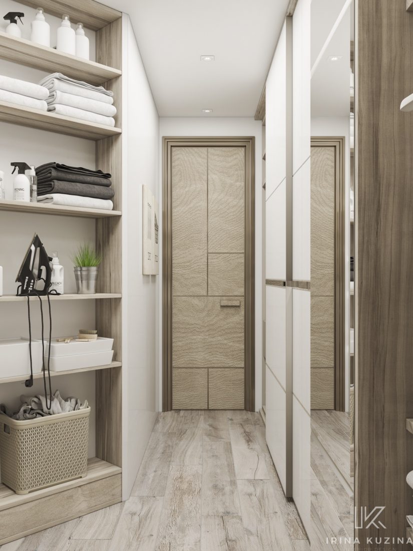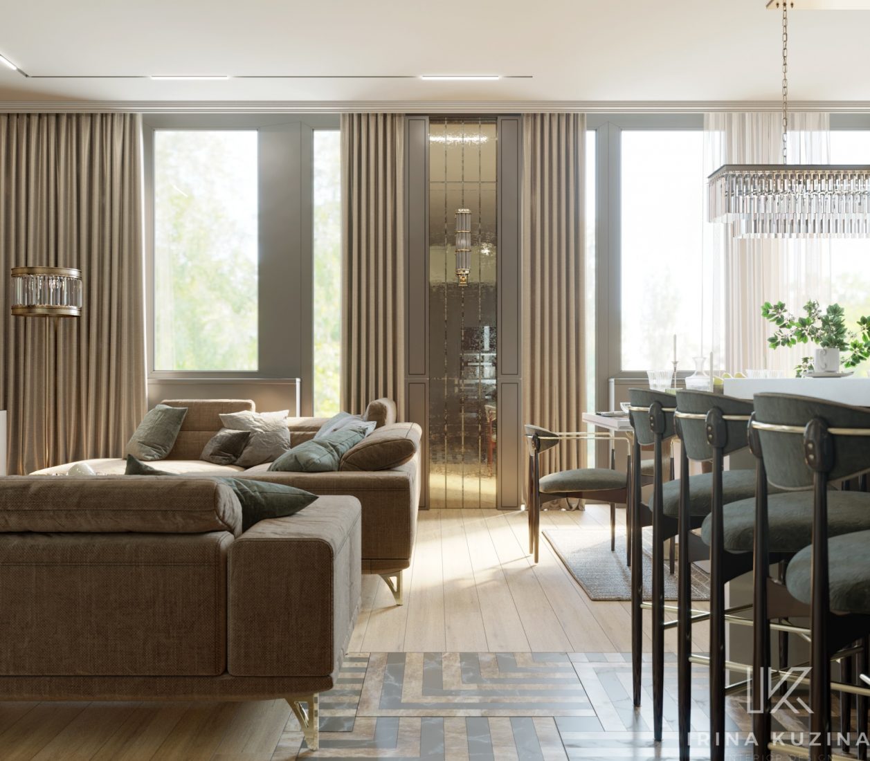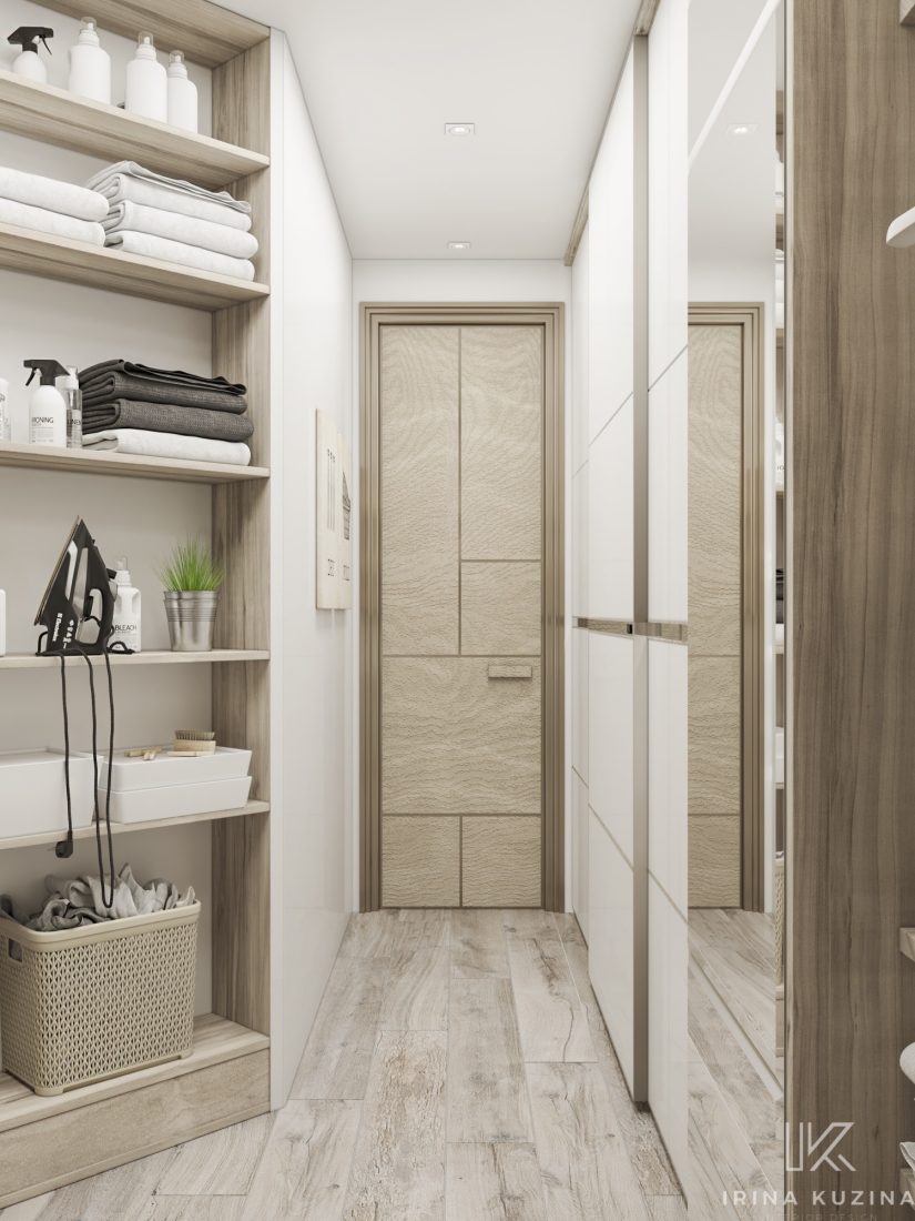 Большой и красивый холл – лицо квартиры, при входе в который сразу понятен тонкий вкус хозяйки. Оригинальное сочетание керамогранита и инженерной доски под ногами задает интересный ритм, который продлевается в общую зону. Также в центре холла консоль и место, где будут стоять живые цветы.