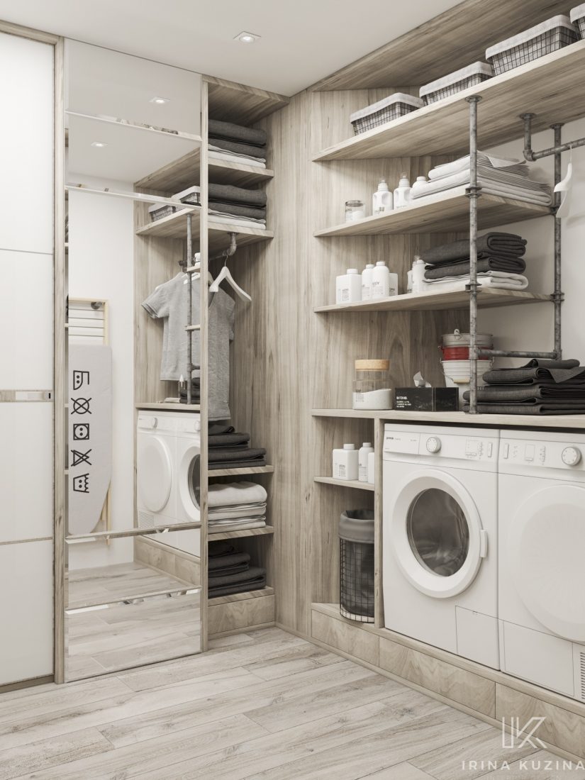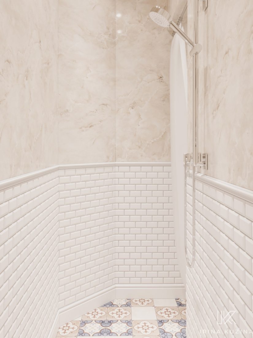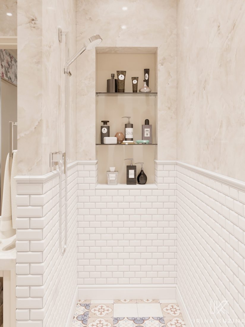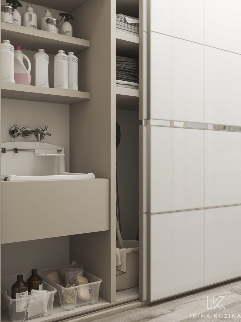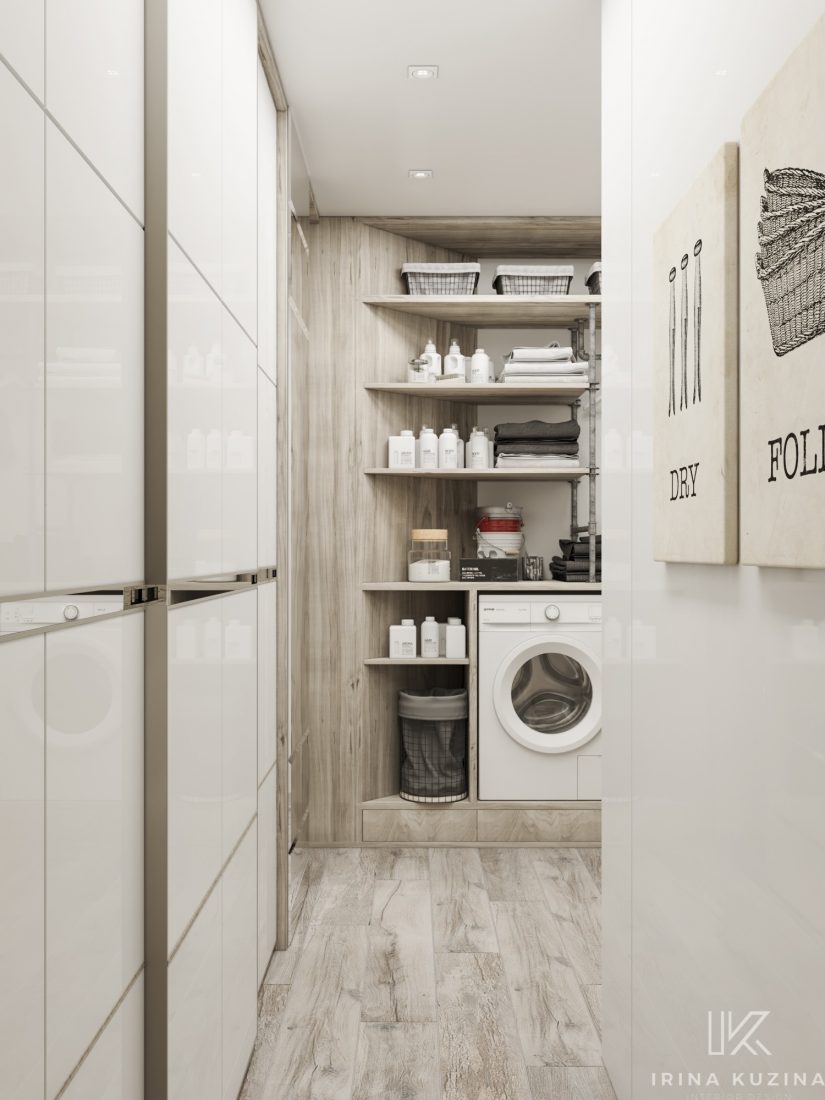 Большой и красивый холл – лицо квартиры, при входе в который сразу понятен тонкий вкус хозяйки. Оригинальное сочетание керамогранита и инженерной доски под ногами задает интересный ритм, который продлевается в общую зону. Также в центре холла консоль и место, где будут стоять живые цветы.