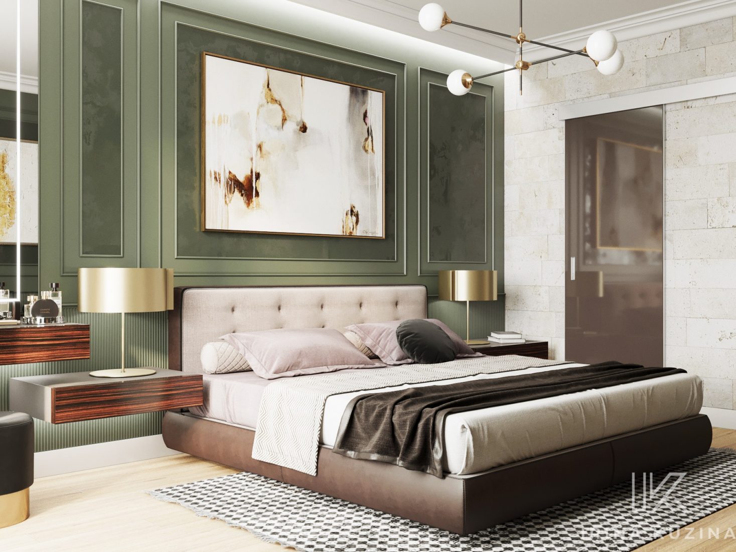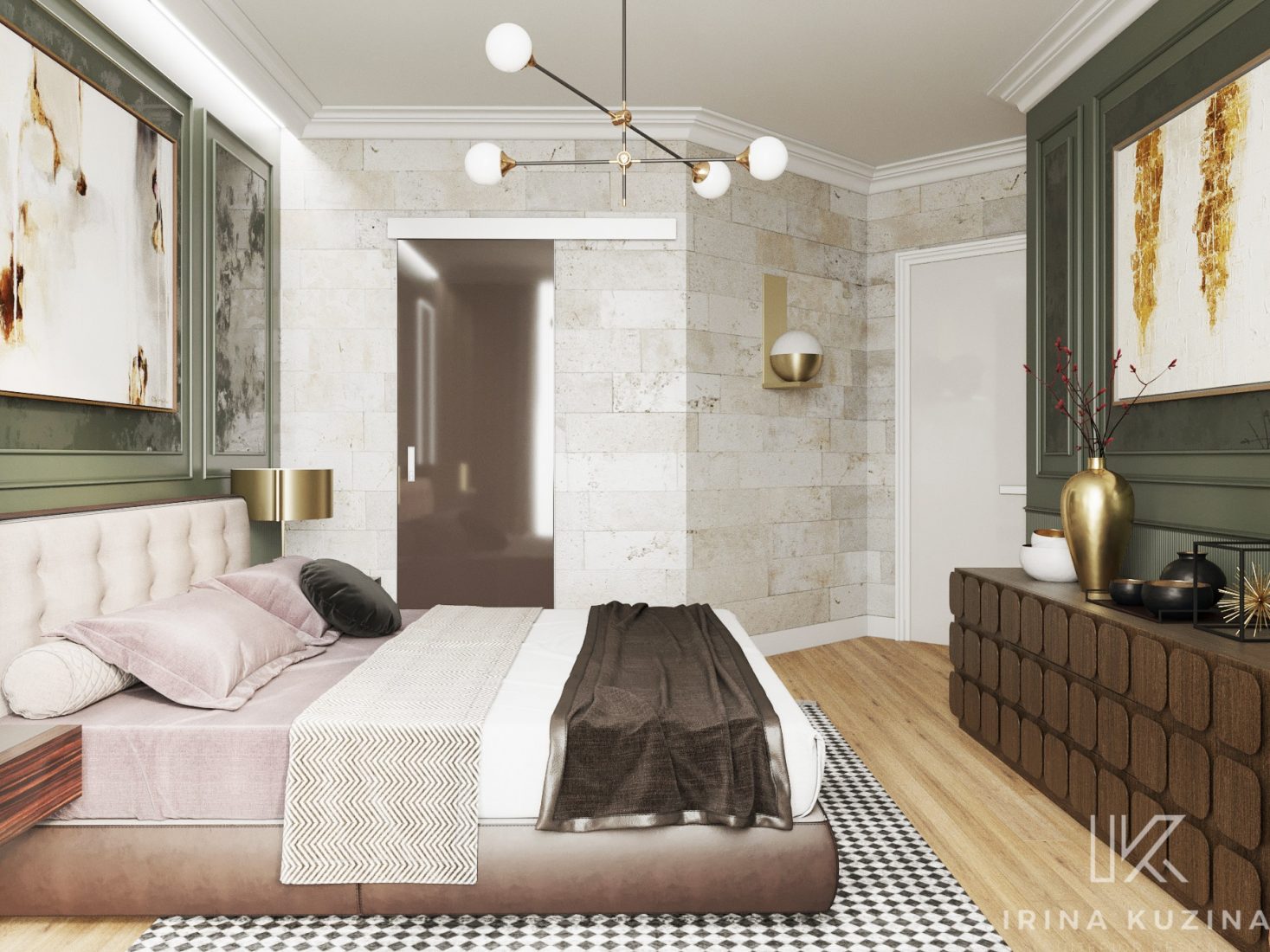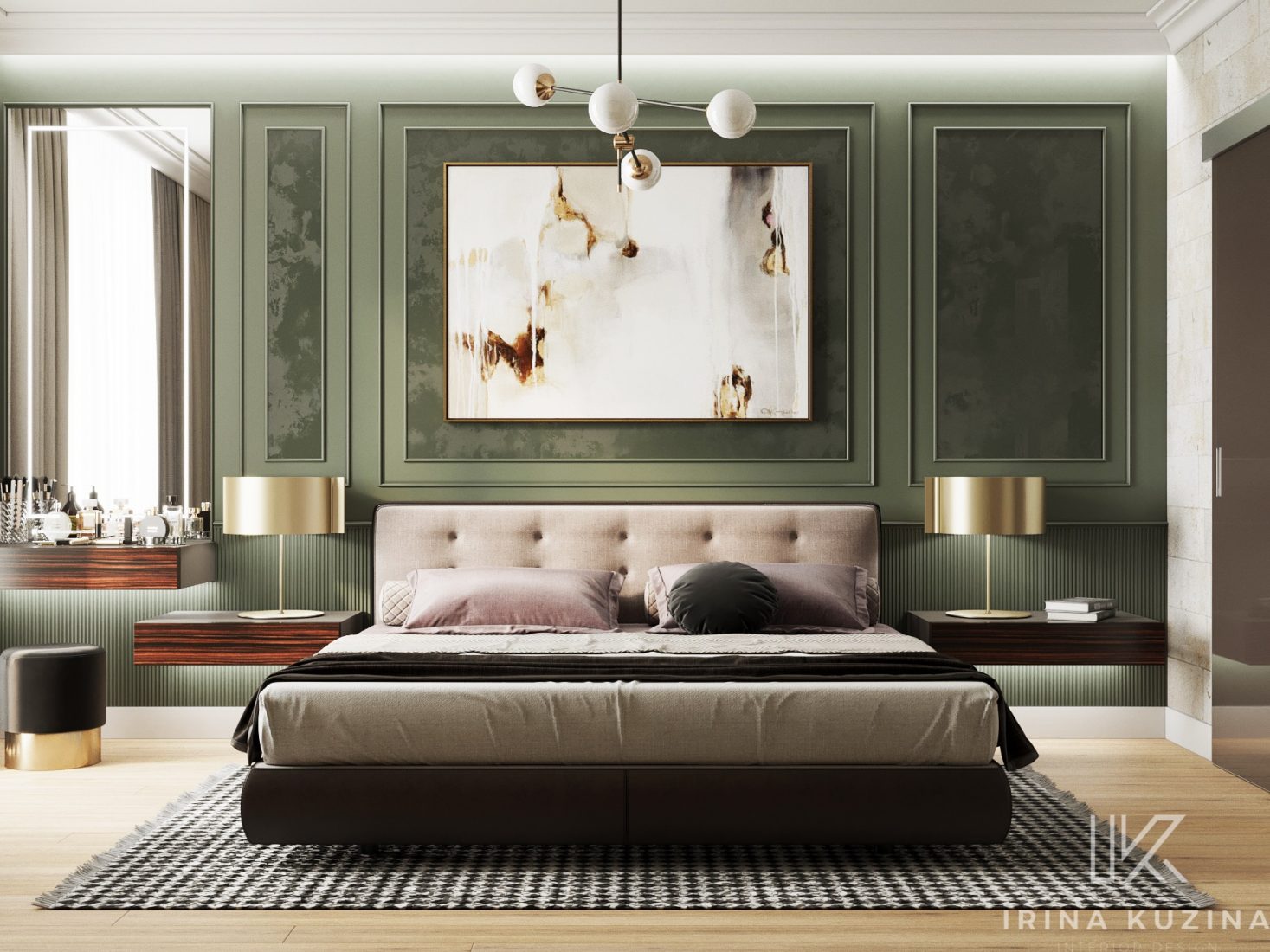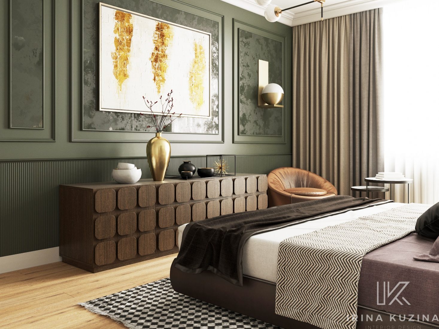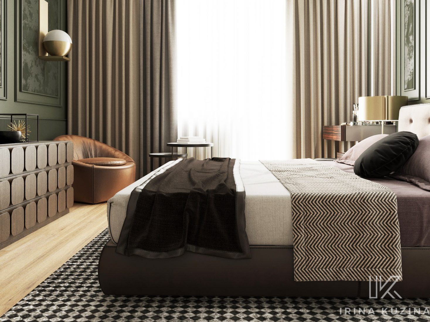 Сложные, глубокие цвета стен, подчеркивают статусность и нетривиальность выбора стиля. Это стильная квартира для большой семьи, где у каждого ее члена своя комната, ванная и гардеробная, не считая кабинета и общей зоны. Основная спальня очень респектабельна, необычна. Цвет отделки, формы, фактуры яркие сами по себе, но не утомительны.
