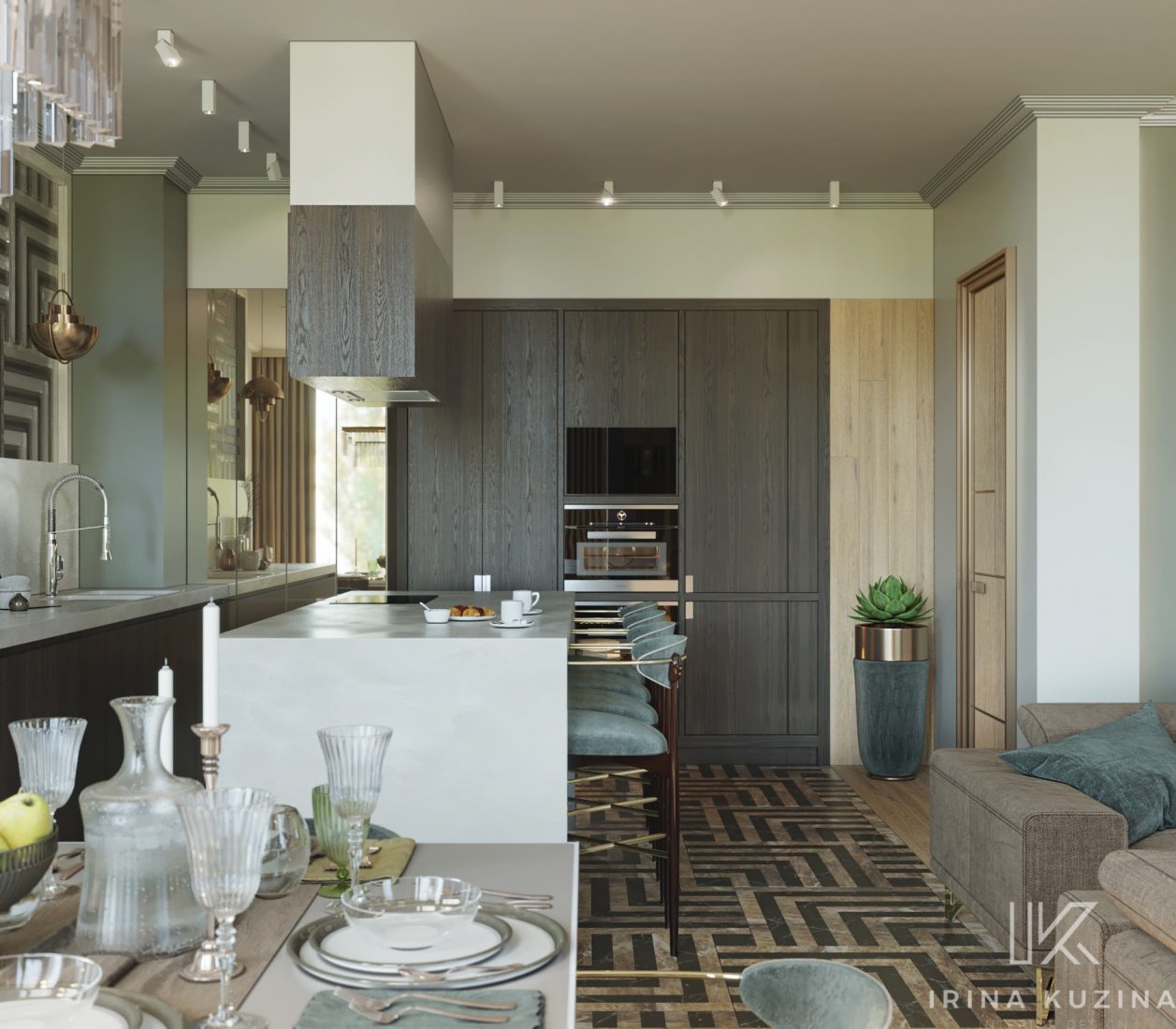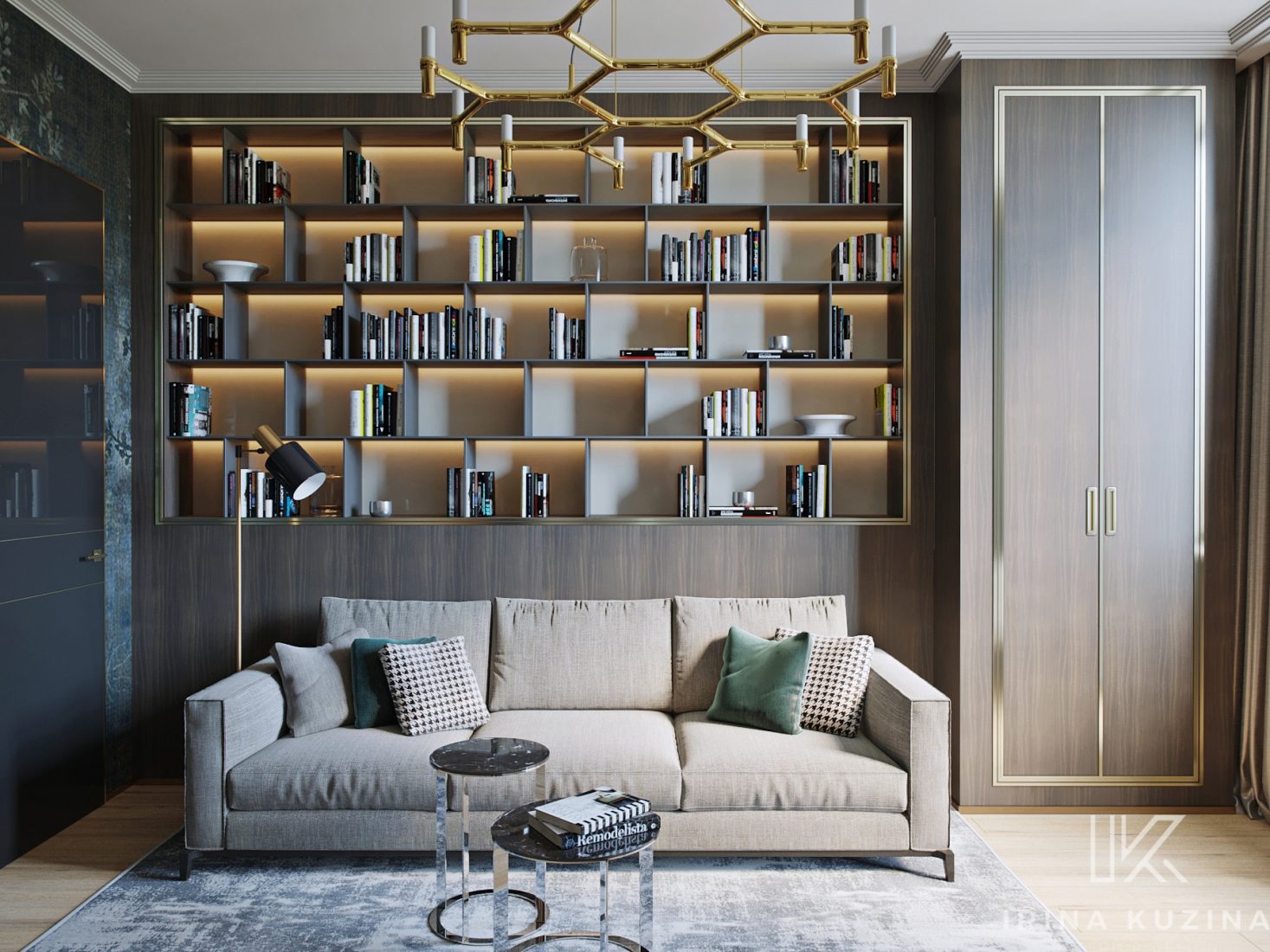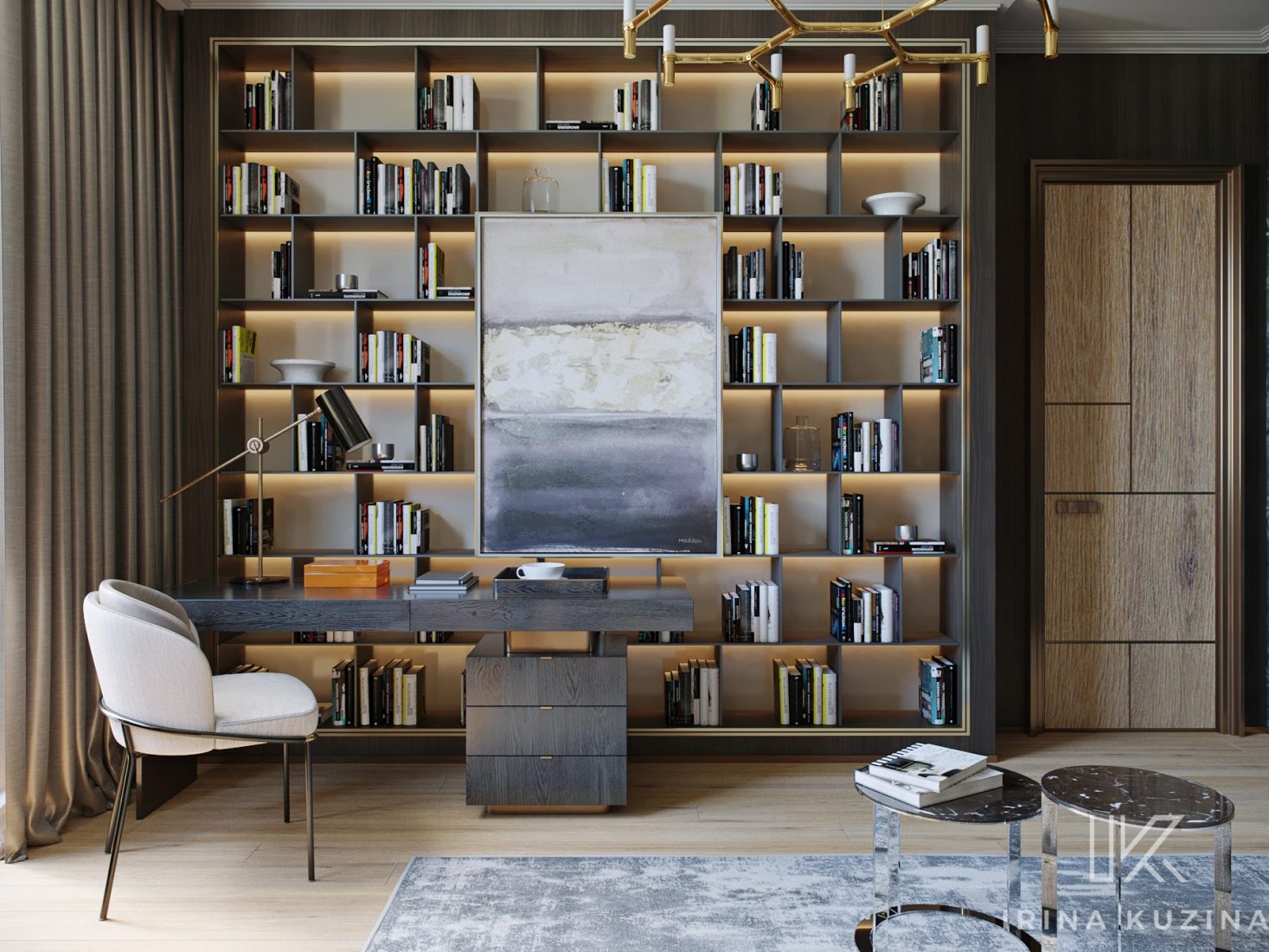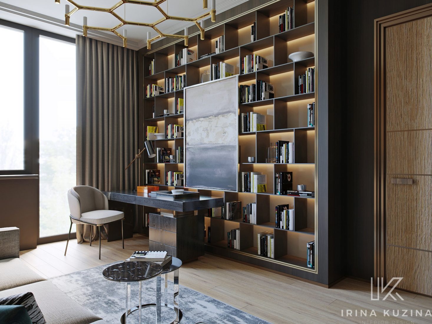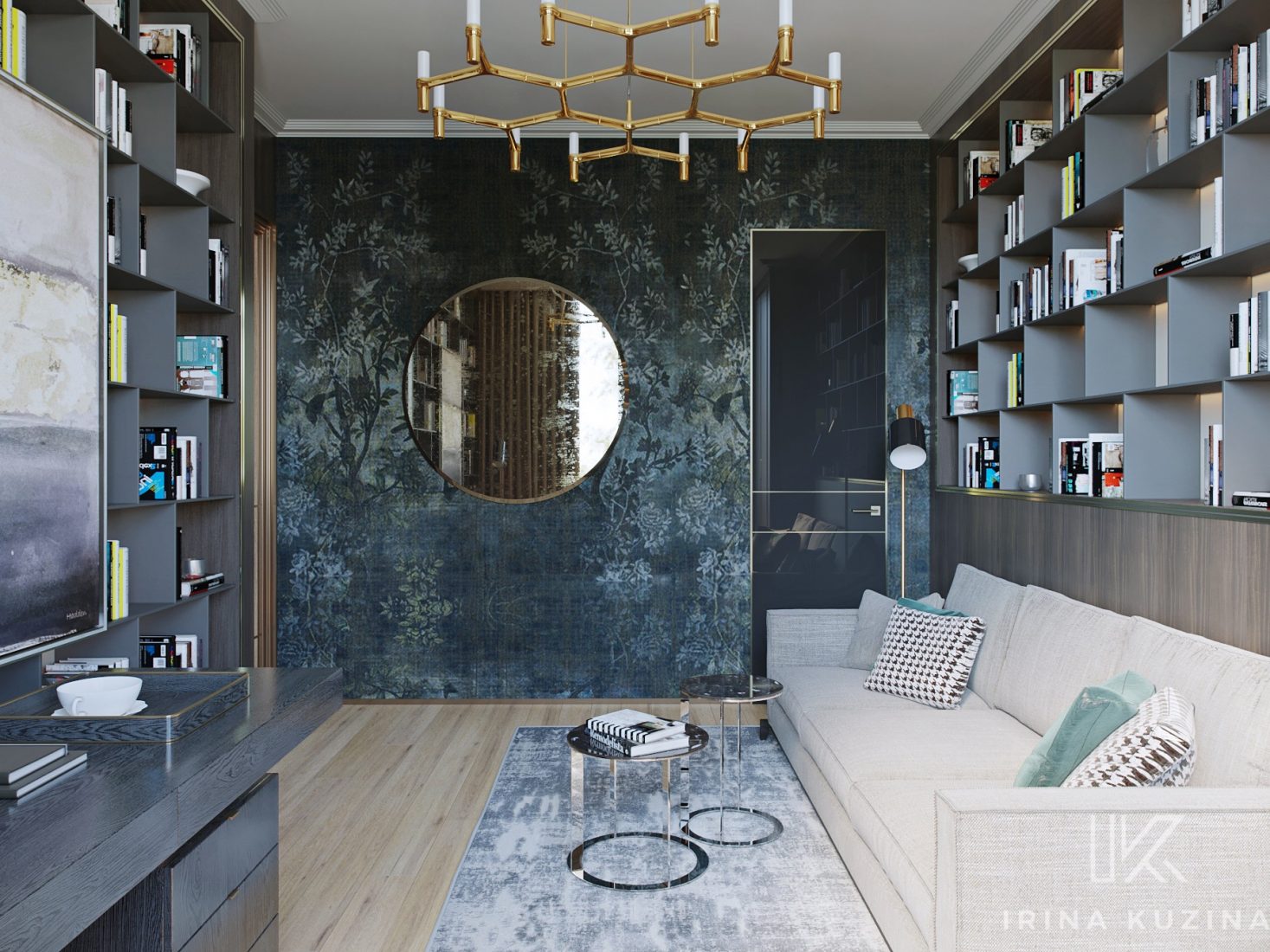 Сложные, глубокие цвета стен, подчеркивают статусность и нетривиальность выбора стиля. Это стильная квартира для большой семьи, где у каждого ее члена своя комната, ванная и гардеробная, не считая кабинета и общей зоны. Основная спальня очень респектабельна, необычна. Цвет отделки, формы, фактуры яркие сами по себе, но не утомительны.