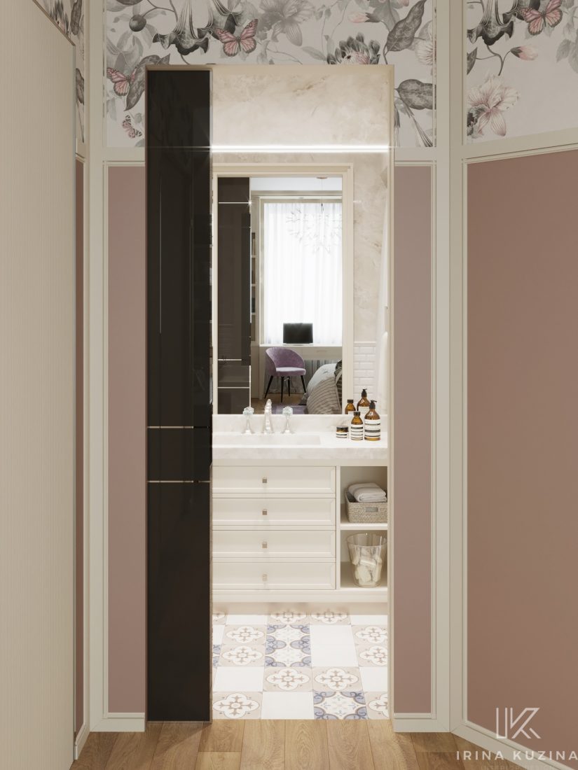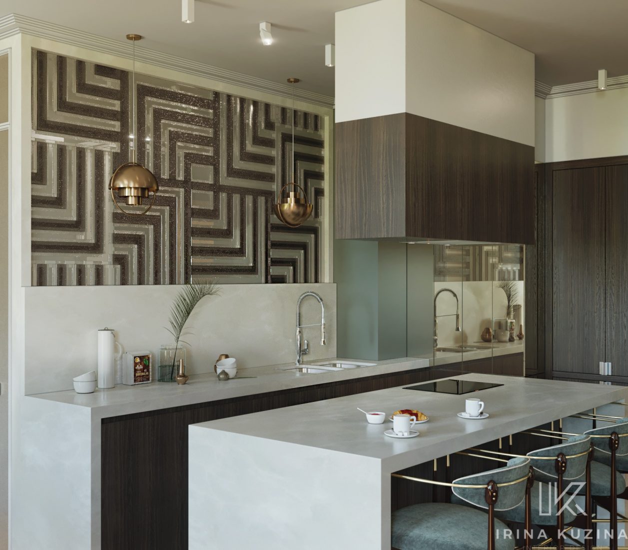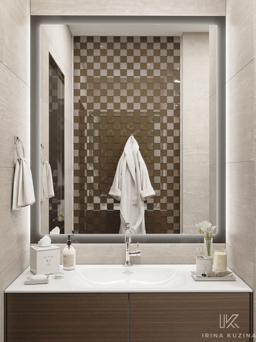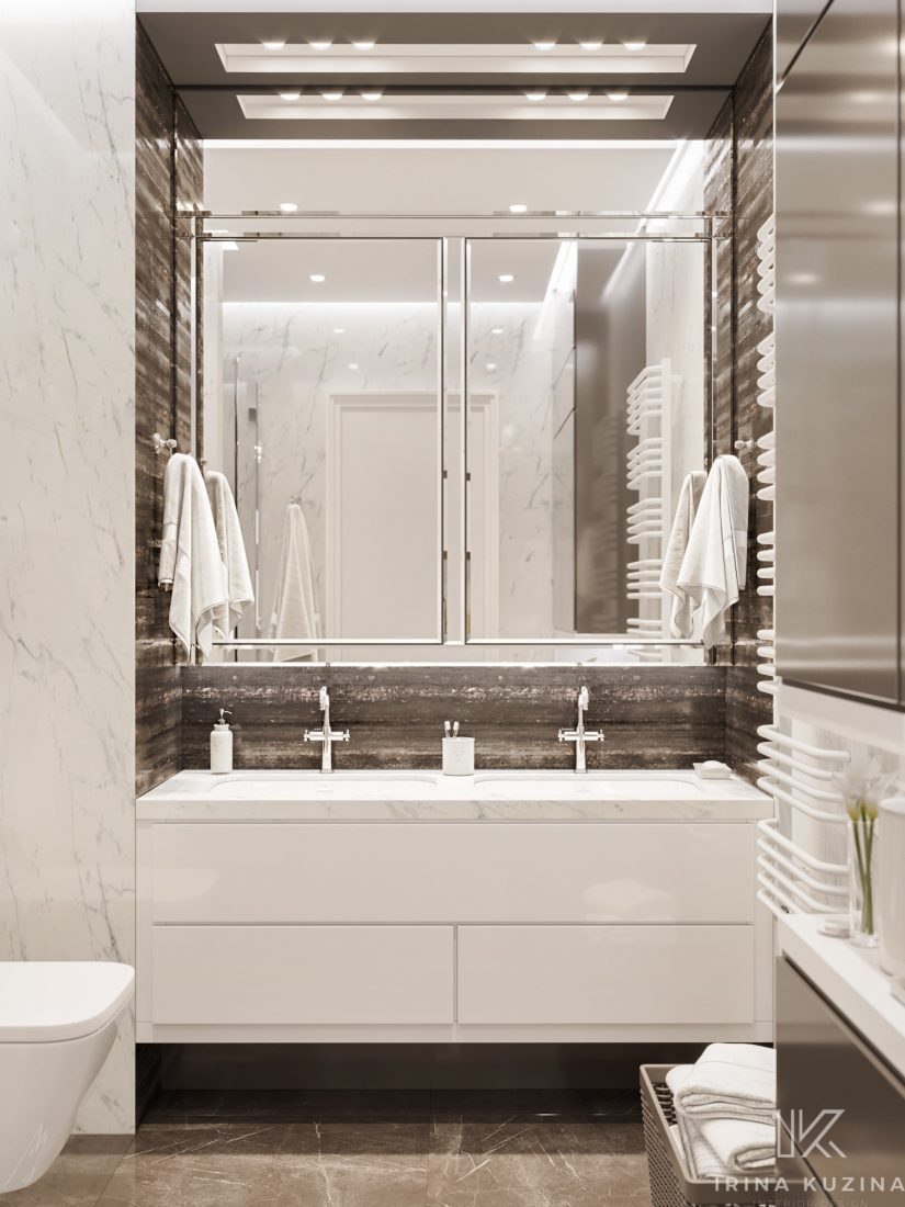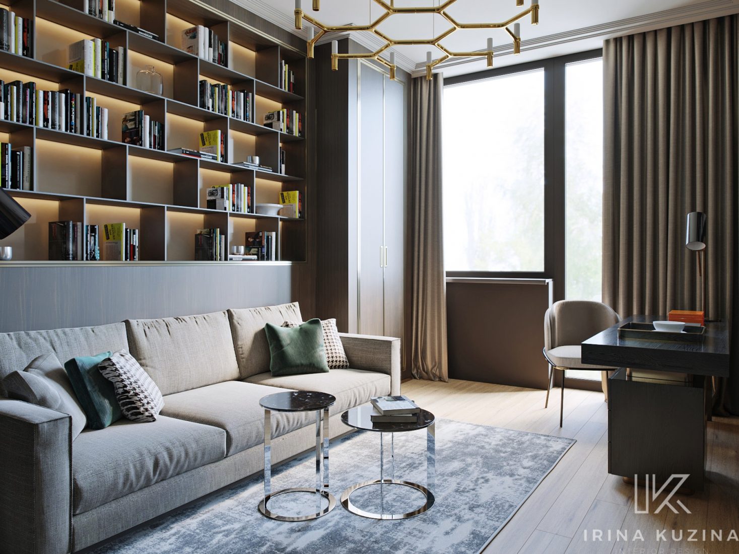 Сложные, глубокие цвета стен, подчеркивают статусность и нетривиальность выбора стиля. Это стильная квартира для большой семьи, где у каждого ее члена своя комната, ванная и гардеробная, не считая кабинета и общей зоны. Основная спальня очень респектабельна, необычна. Цвет отделки, формы, фактуры яркие сами по себе, но не утомительны.