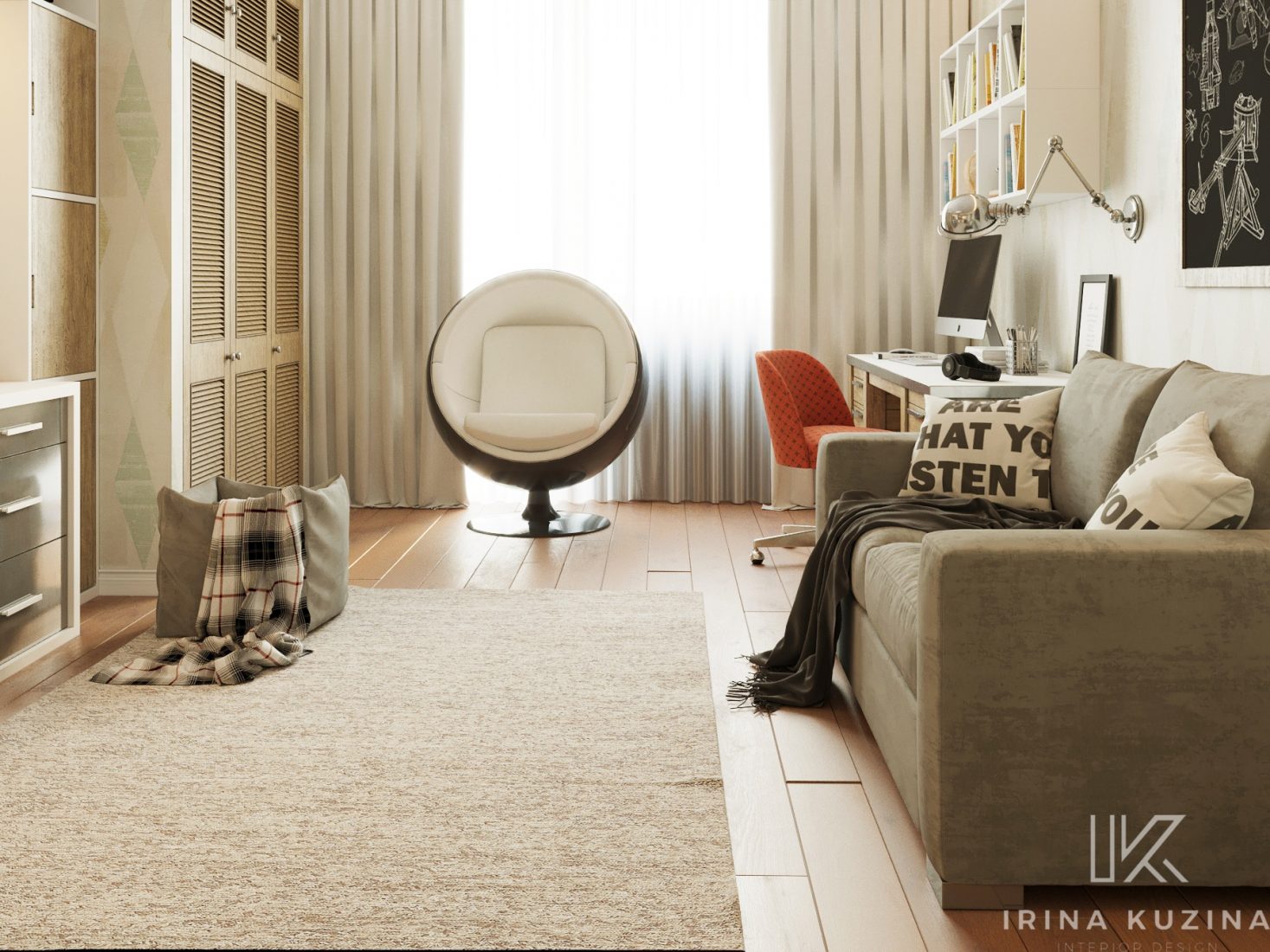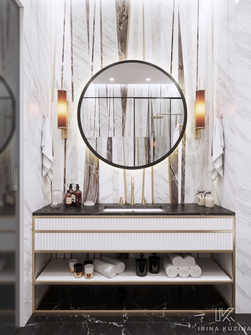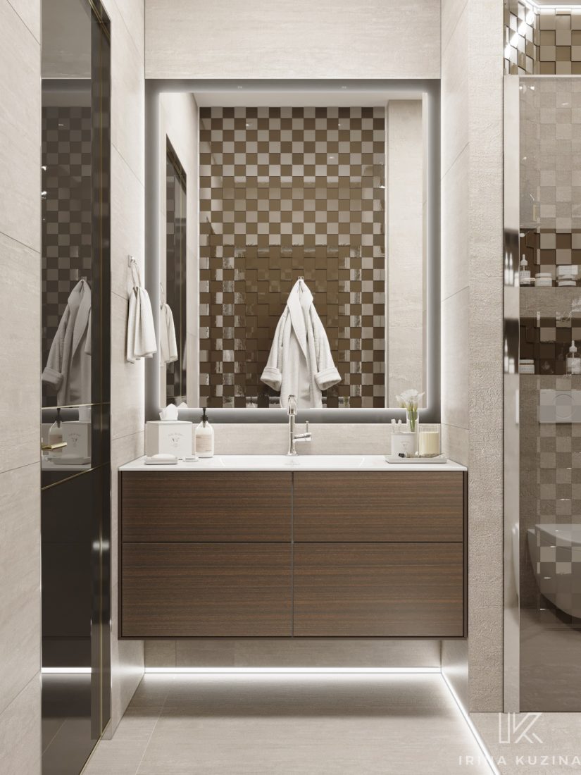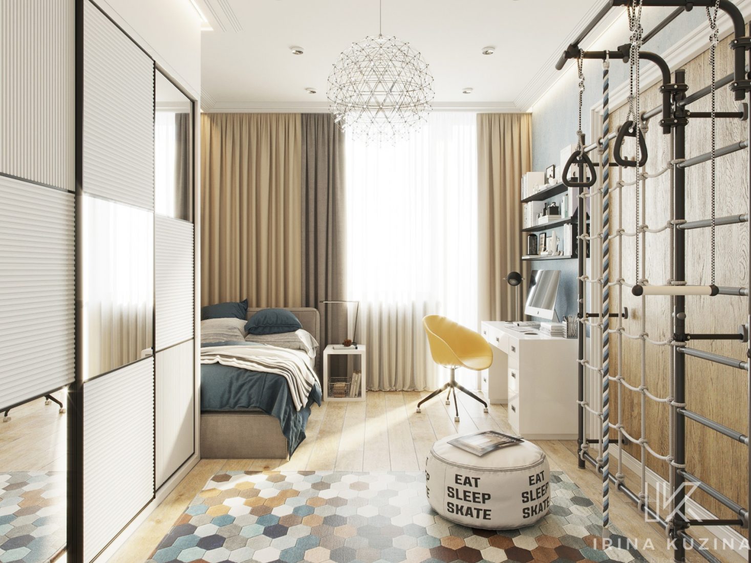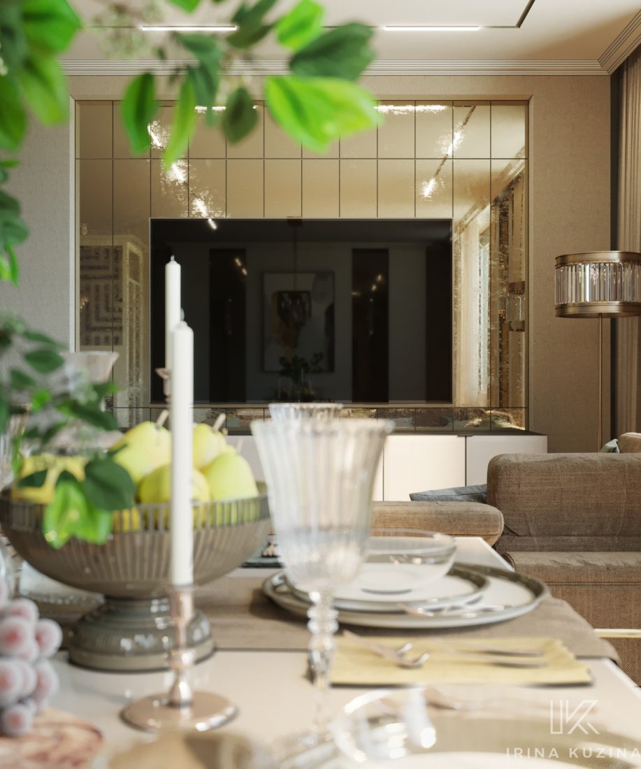 Сложные, глубокие цвета стен, подчеркивают статусность и нетривиальность выбора стиля. Это стильная квартира для большой семьи, где у каждого ее члена своя комната, ванная и гардеробная, не считая кабинета и общей зоны. Основная спальня очень респектабельна, необычна. Цвет отделки, формы, фактуры яркие сами по себе, но не утомительны.