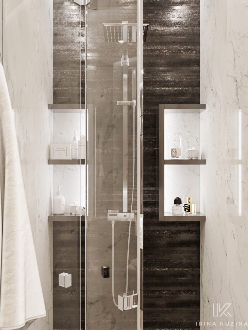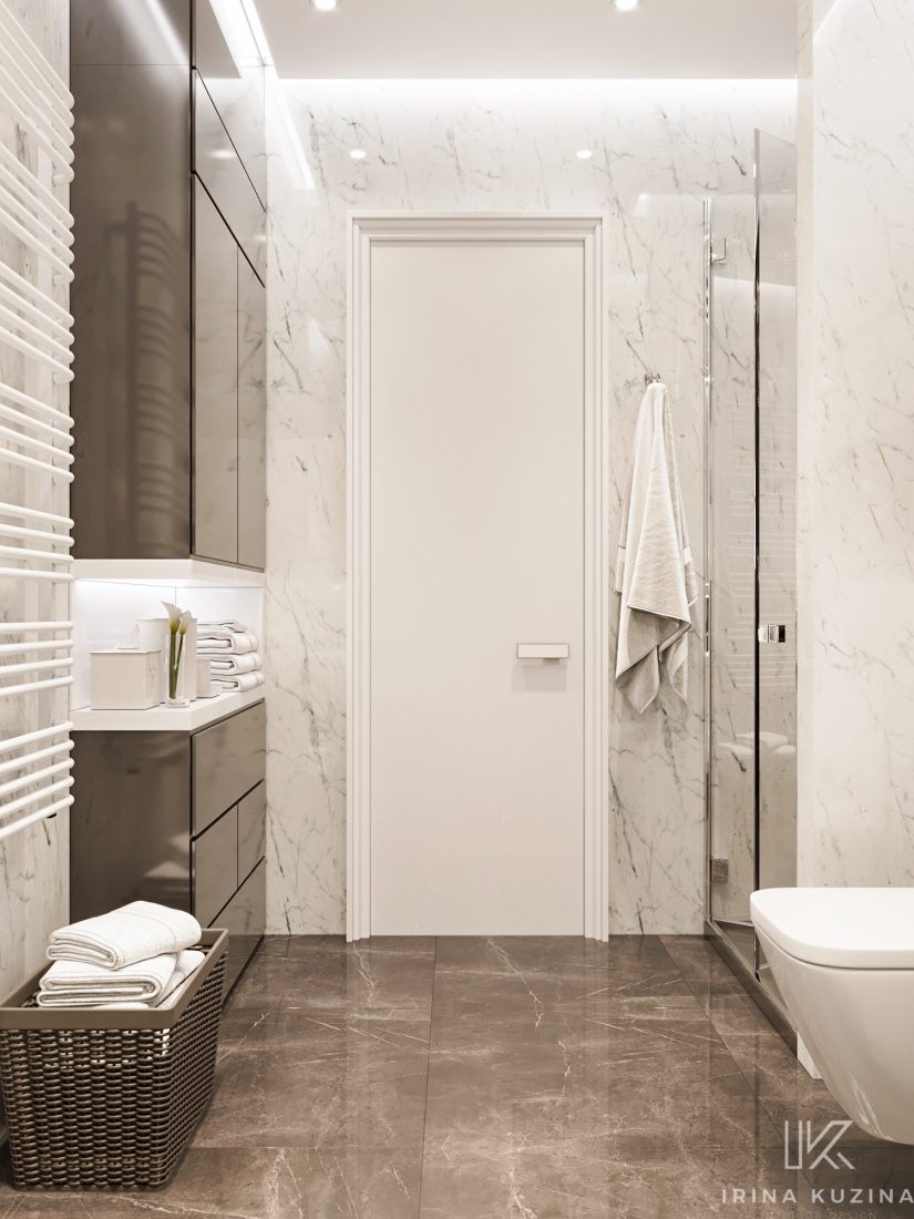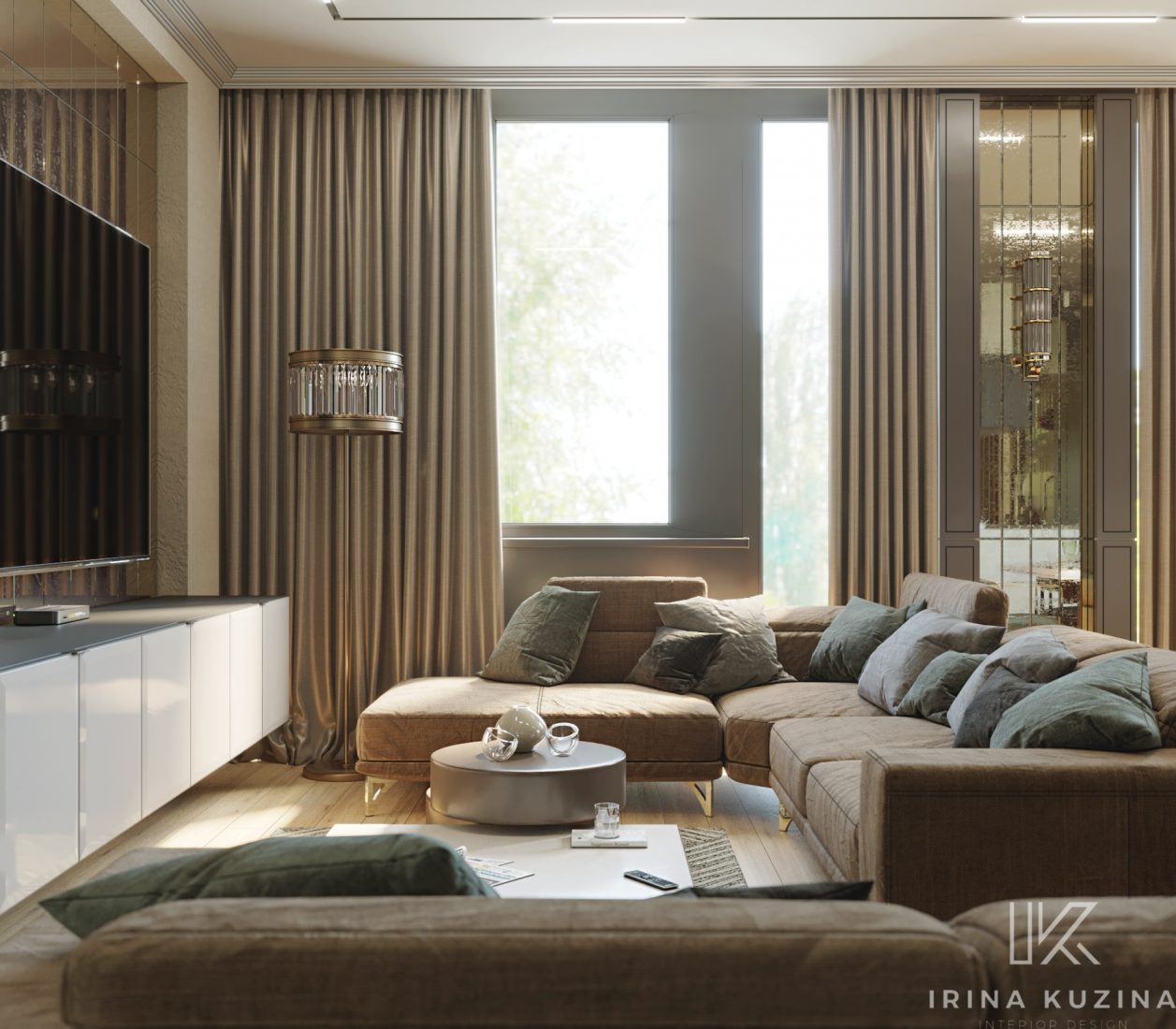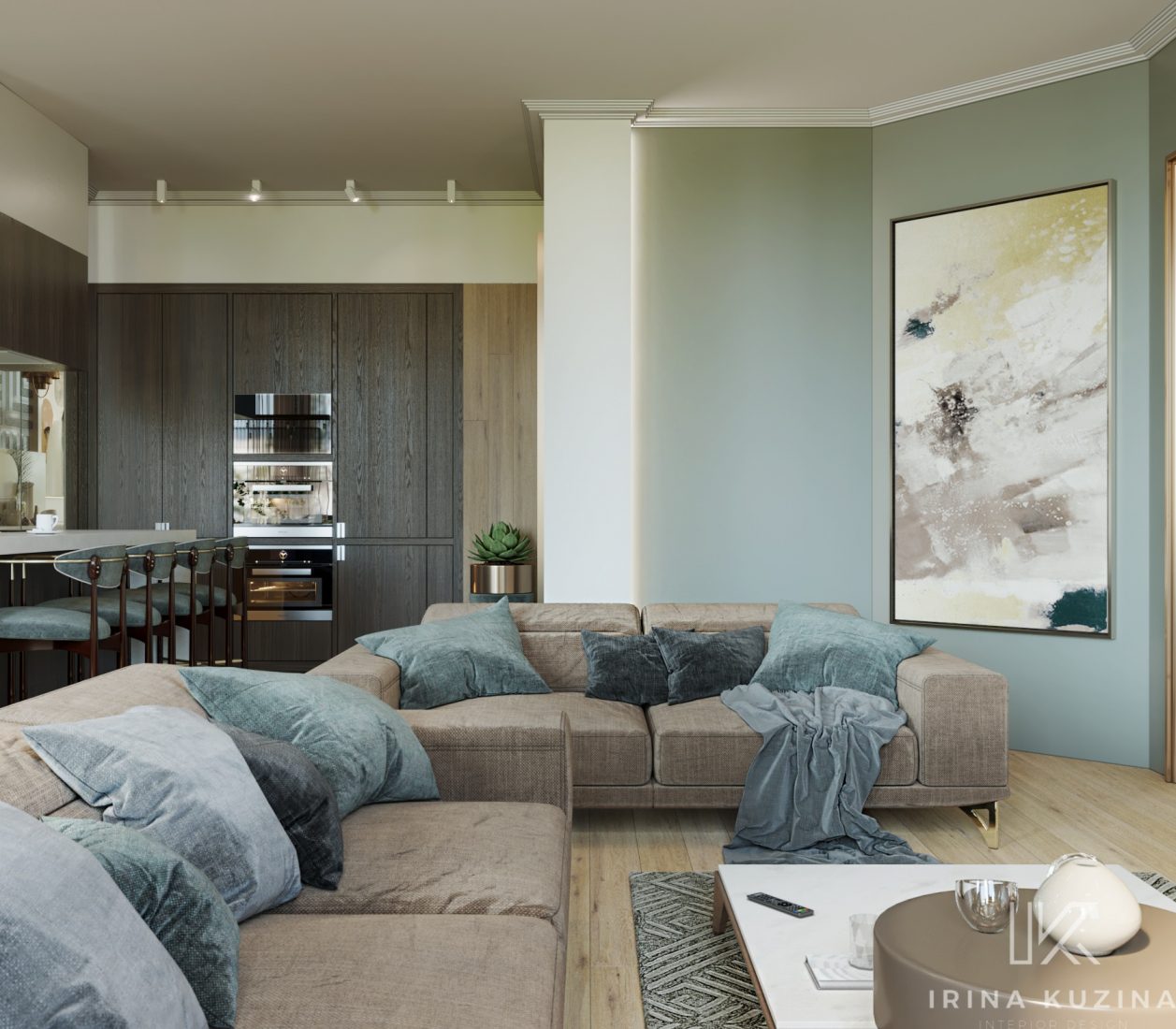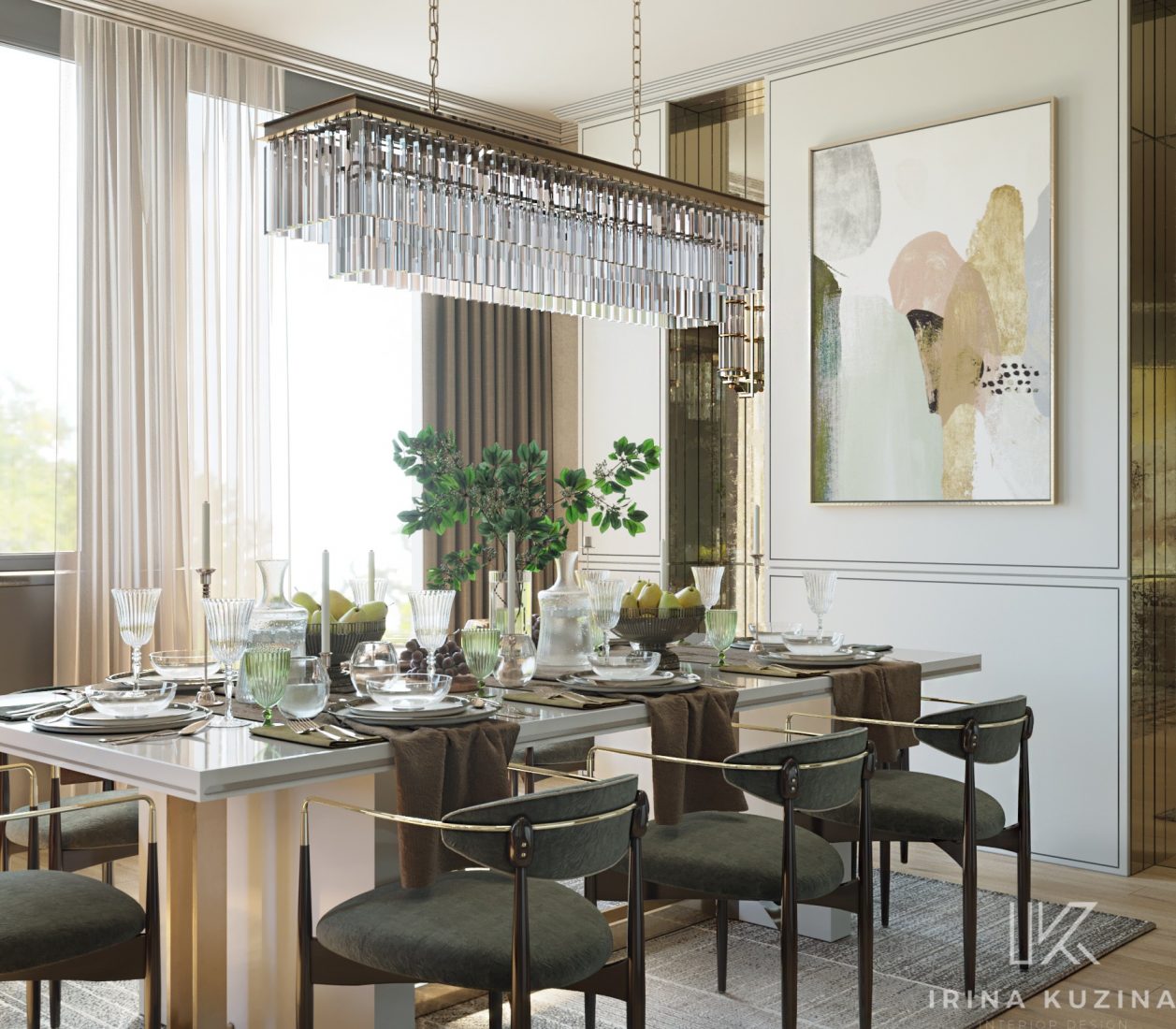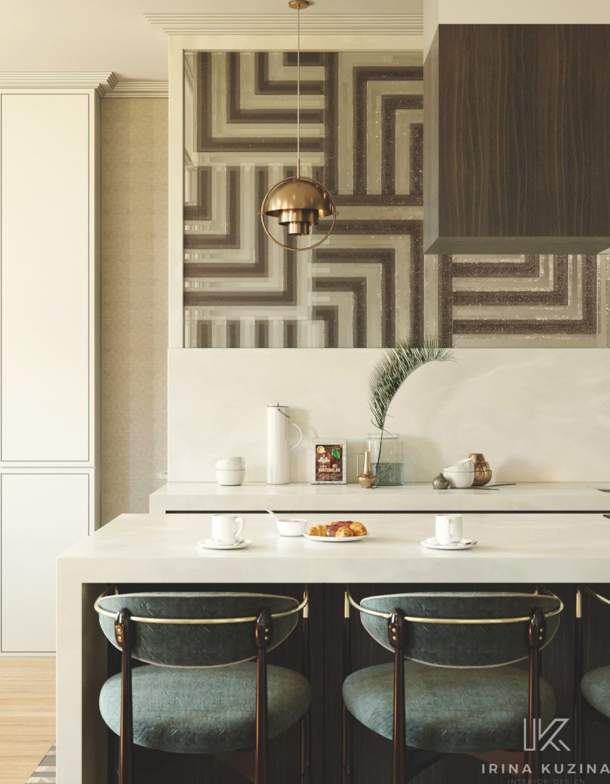 Сложные, глубокие цвета стен, подчеркивают статусность и нетривиальность выбора стиля. Это стильная квартира для большой семьи, где у каждого ее члена своя комната, ванная и гардеробная, не считая кабинета и общей зоны. Основная спальня очень респектабельна, необычна. Цвет отделки, формы, фактуры яркие сами по себе, но не утомительны.