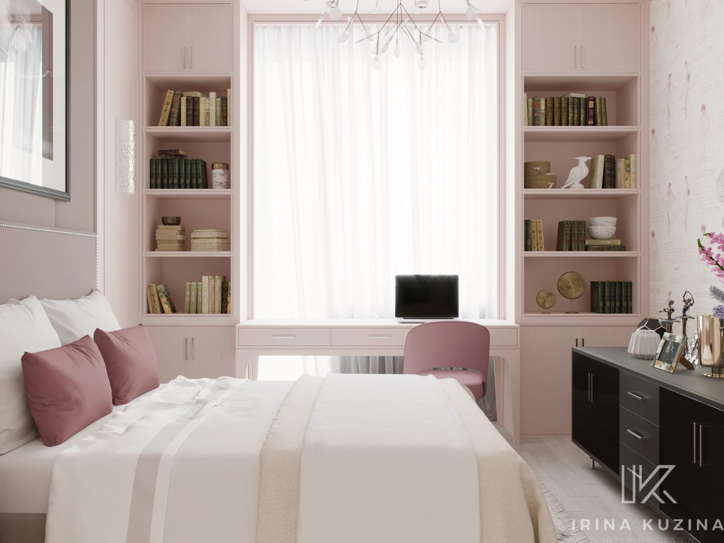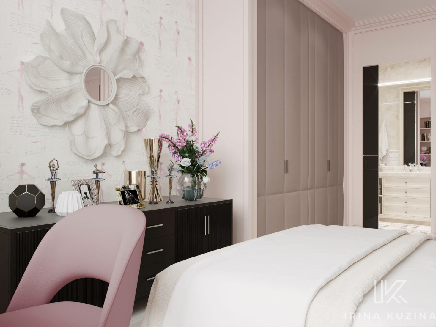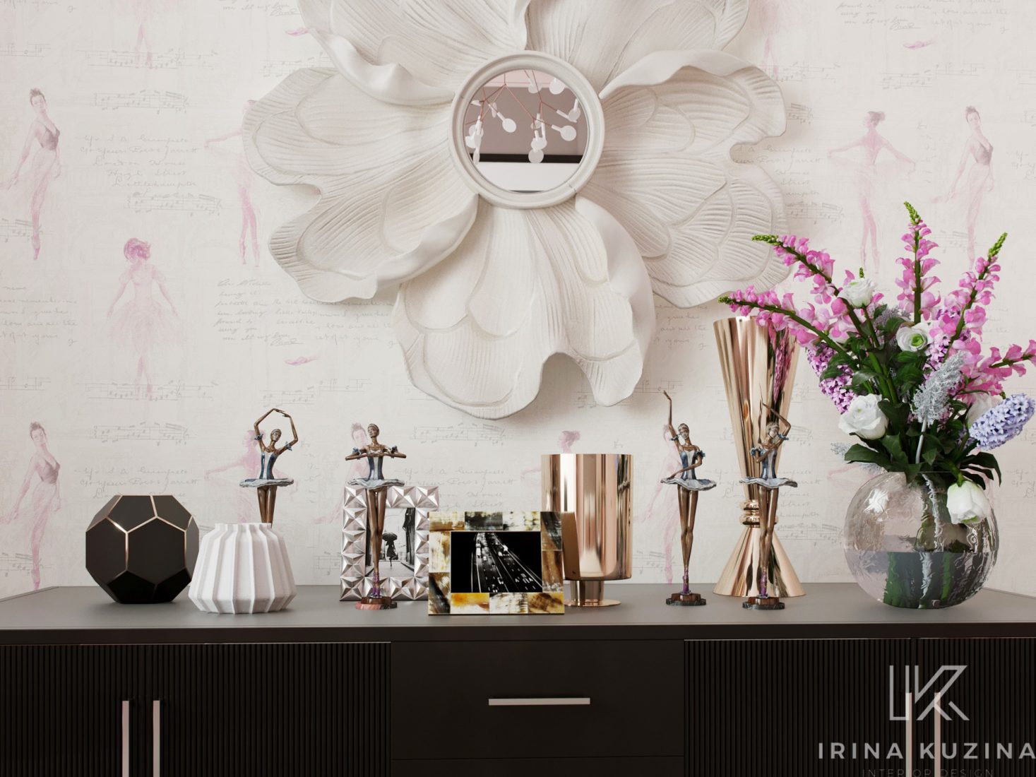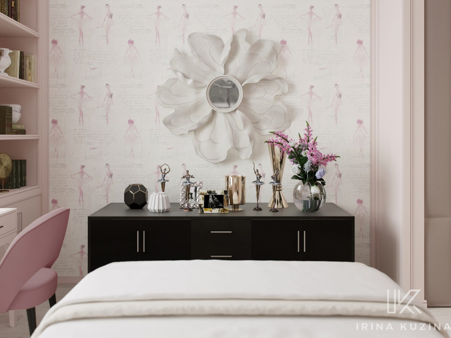 Например, дочка занимается балетом, и ей предложили на двух стенах нежные и романтичные обои с балеринами. И не забыли про мини-балетный станок.