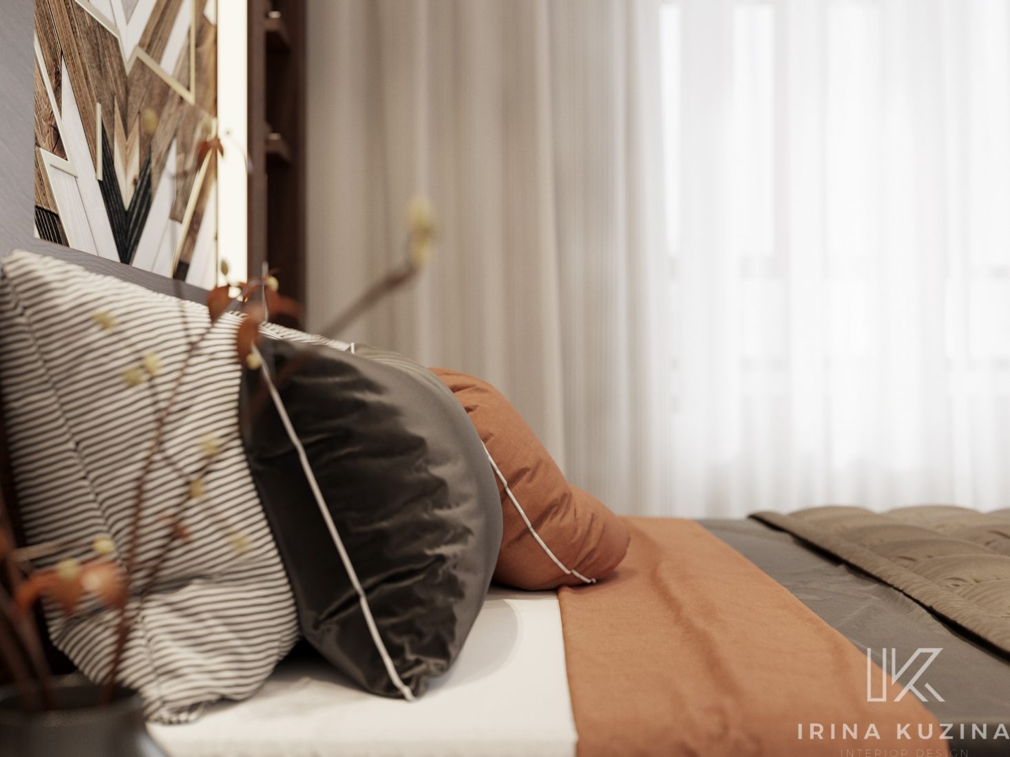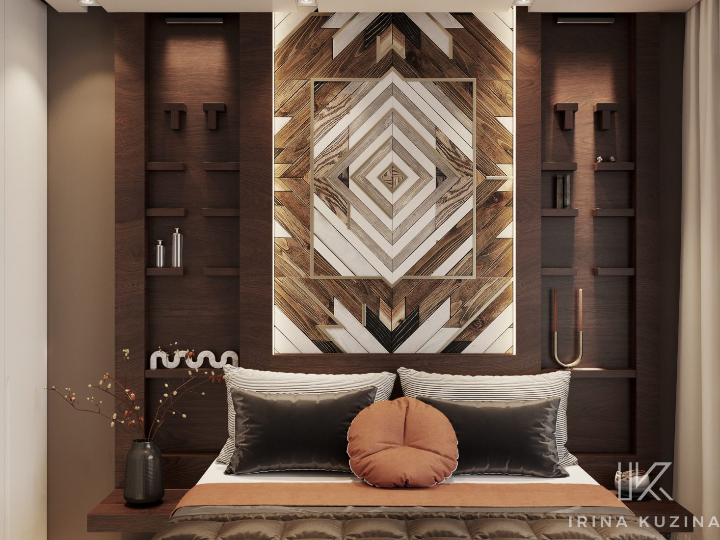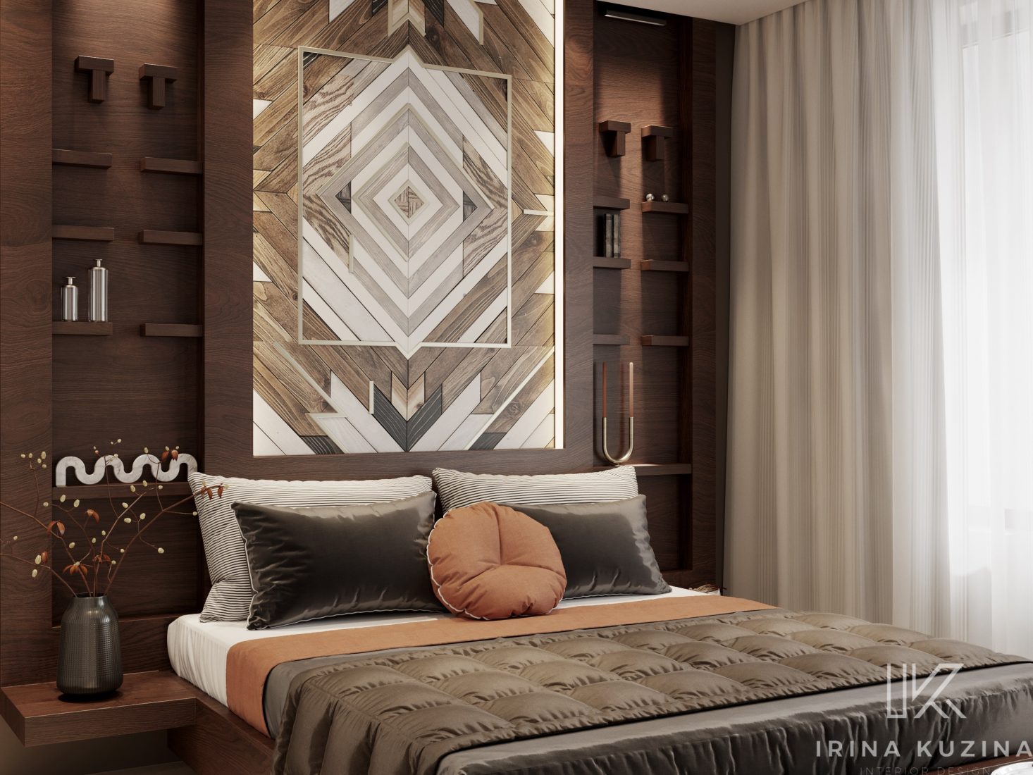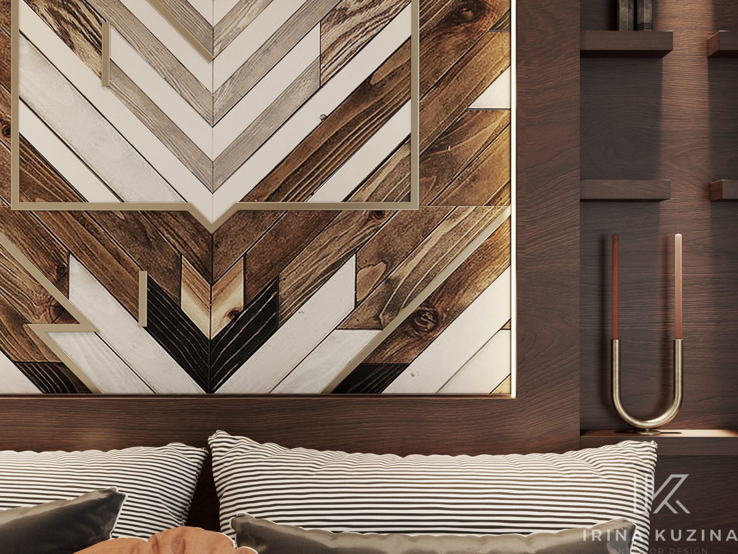 В изголовье кровати в качестве декора мы использовали паркетную доску, узором «бабочка», что обычно применяют в распиле мрамора. Этот же прием и у нас, только в дереве.